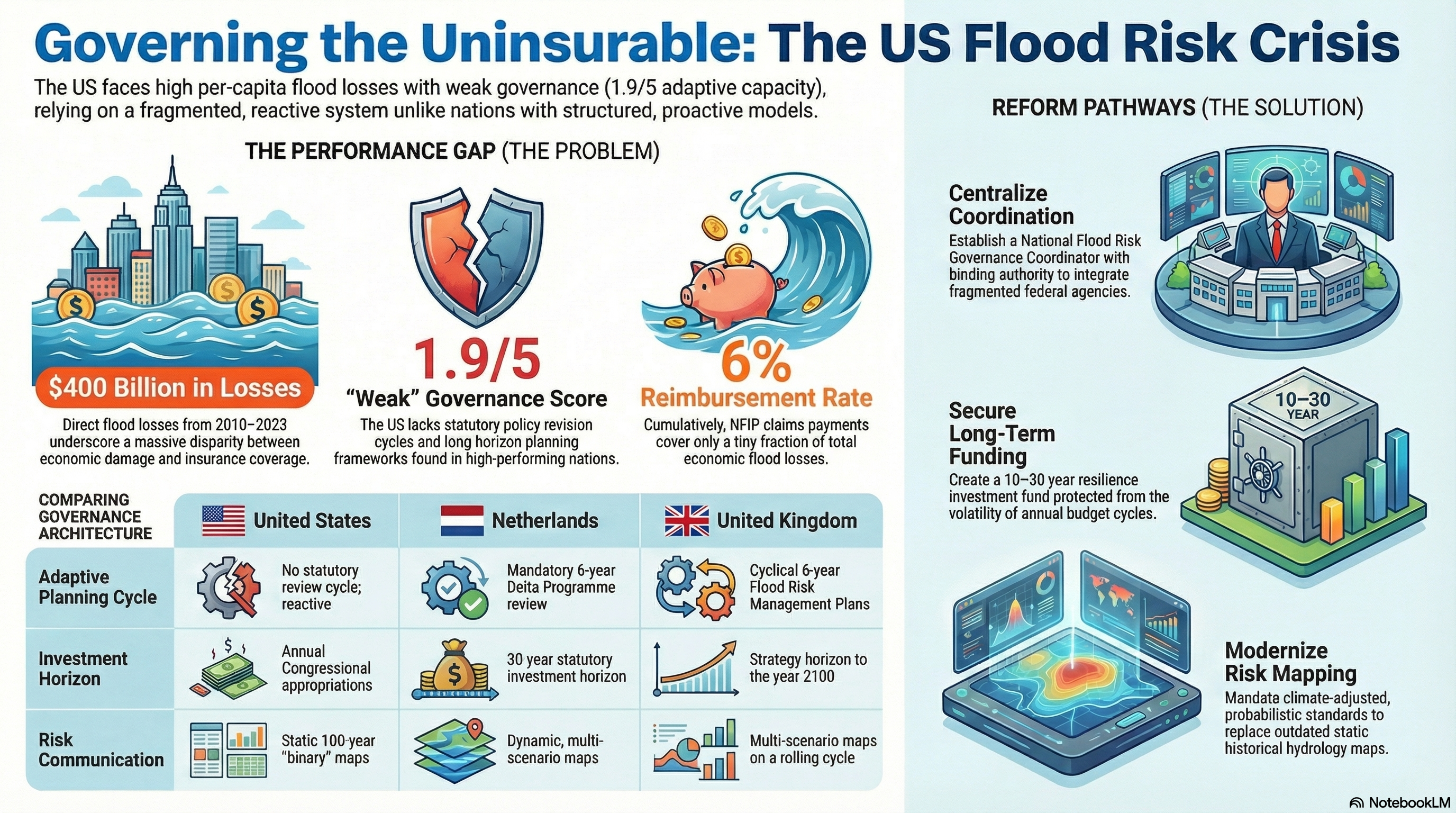 - United States: Characterized by a reactive, disaster‑driven approach; NFIP reauthorization is subject to frequent lapses and lacks a statutory review cycle.