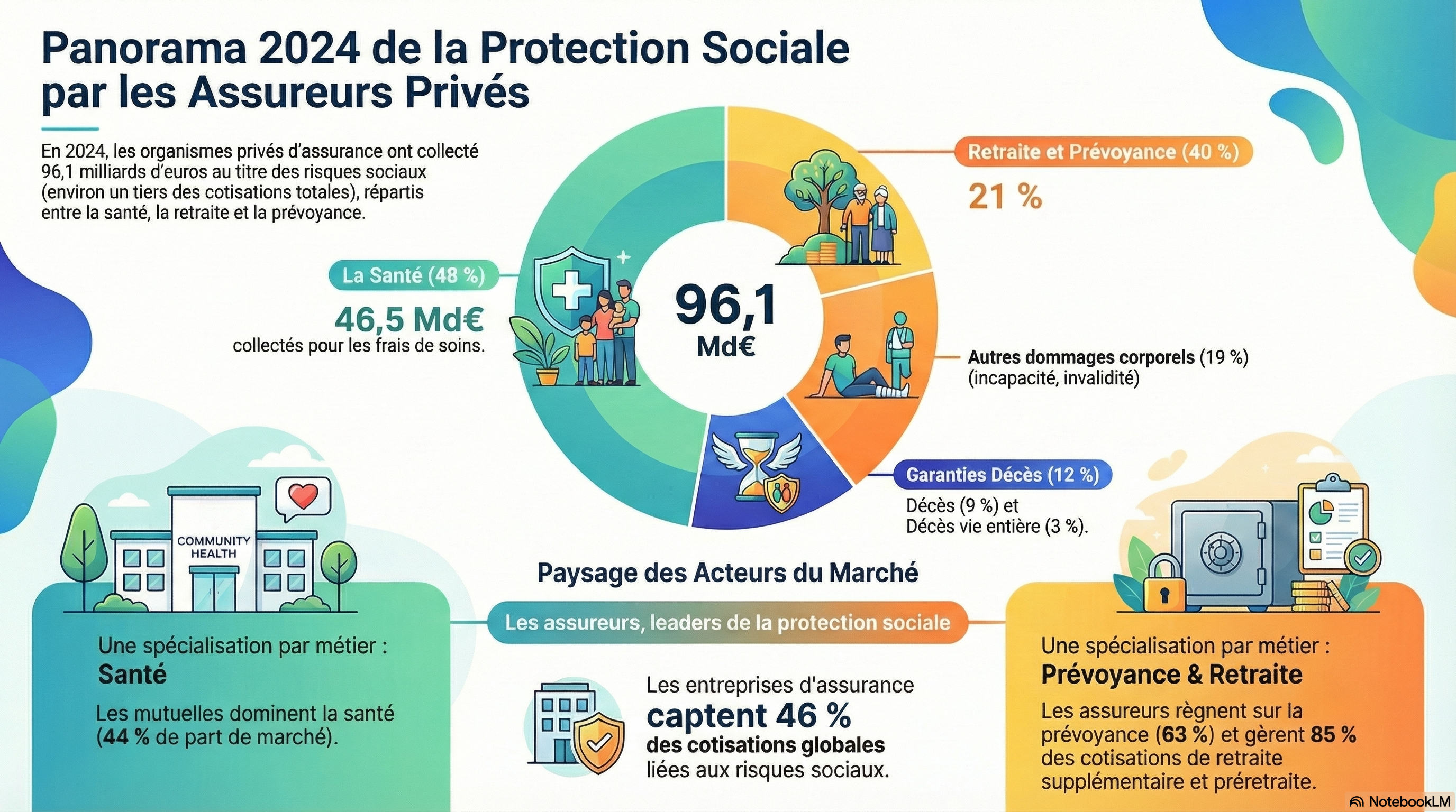 - 96,1 milliards d'euros : volume spécifiquement alloué à la couverture des risques sociaux, représentant environ un tiers de l'activité globale du secteur.