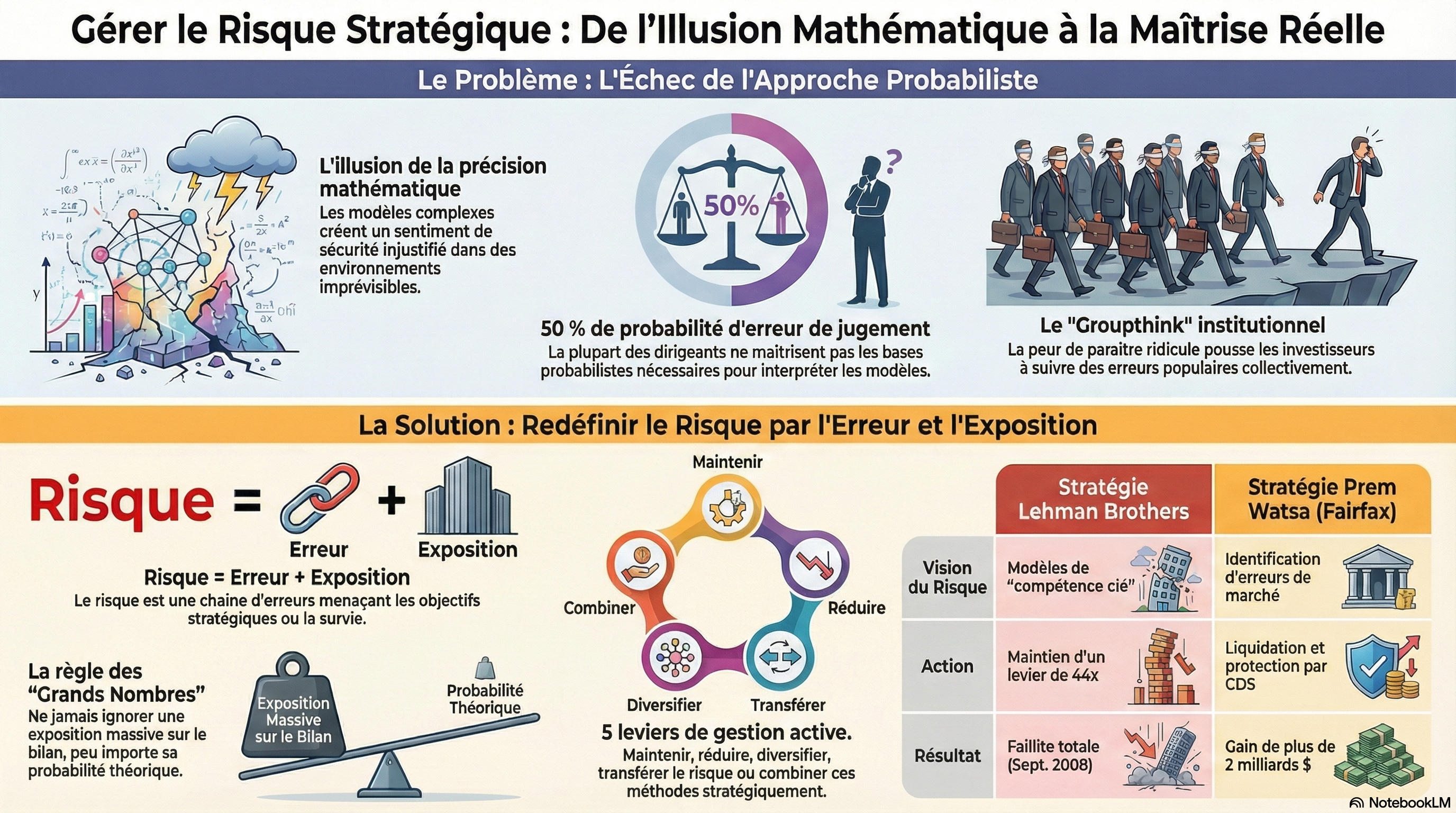 À l'opposé, Dick Fuld affichait un excès de confiance, qualifiant la gestion des risques de Lehman de « compétence clé » tout en maintenant un levier financier de 44 fois les fonds propres. Fuld a succombé au biais de confirmation, là où Watsa a agi sur l'analyse des accumulations.