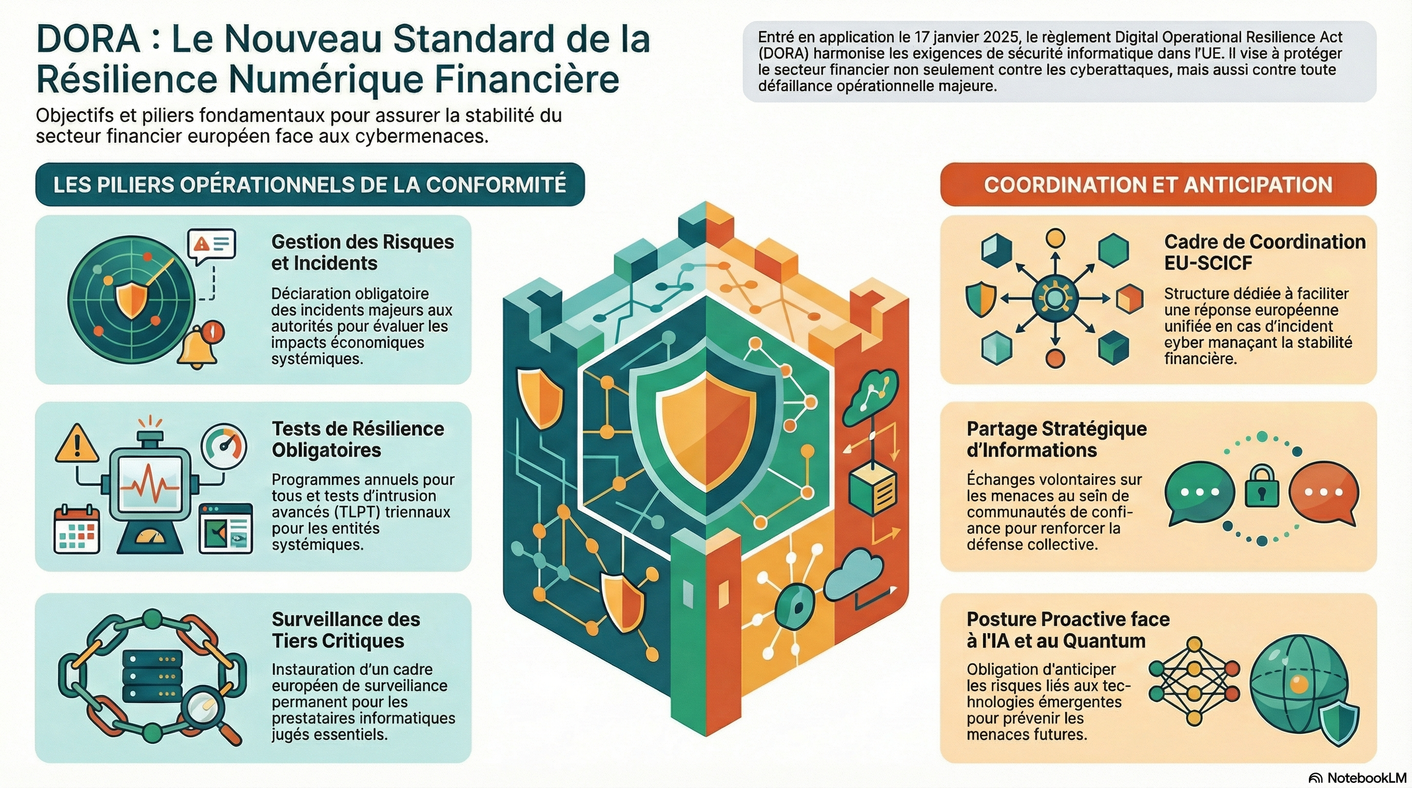 - Le partage d'informations : Le règlement encourage le partage d'informations sur les cybermenaces entre les entités financières au sein de communautés de confiance, ainsi qu'avec les superviseurs.