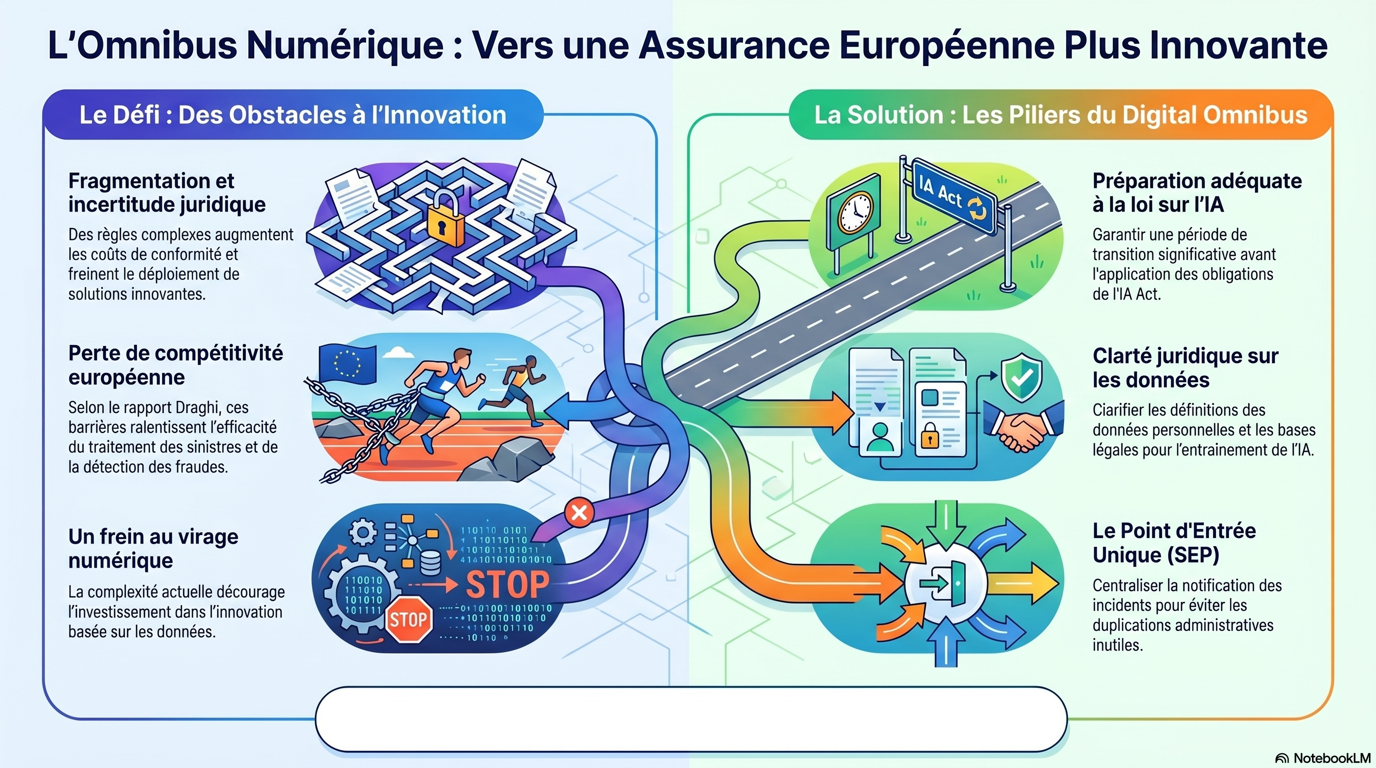 L'initiative « Digital Omnibus » s'affirme comme un levier stratégique de modernisation du cadre numérique européen, visant à adapter l'environnement réglementaire aux mutations technologiques. Cette analyse s'appuie sur le document d'Insurance Europe « Supporting Innovation and Consumer Protection in Insurance: Why the Digital Omnibus Matters » daté d'avril 2026. Ce projet s'inscrit dans le prolongement direct des conclusions du rapport Draghi, lequel identifie un véritable « piège des barrières réglementaires » (regulatory barriers trap) entravant la croissance et la compétitivité du continent face à l'innovation mondiale axée sur les données.