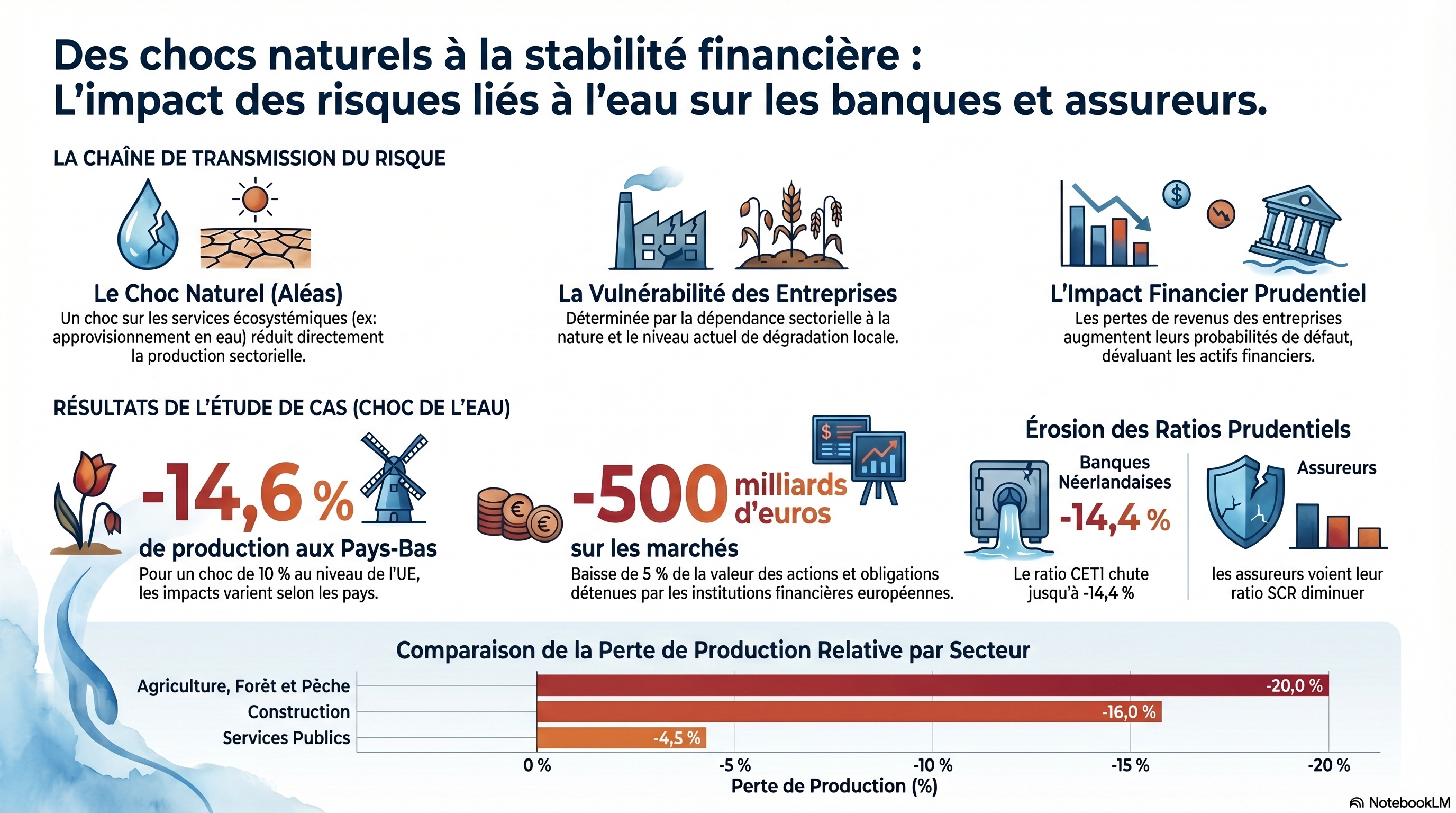 La reconnaissance des risques liés à la nature comme déterminants systémiques pour la stabilité financière s'est imposée dans l'agenda des autorités de supervision (NGFS, BCE, DNB). Initialement cantonnée à des analyses qualitatives, la communauté des banques centrales converge désormais vers une quantification rigoureuse des canaux de transmission. Le document de travail No. 857 de la DNB propose un cadre de stress‑test « top‑down » reliant les chocs biophysiques à l'économie réelle et au secteur financier. L'étude utilise les risques liés à l'eau comme proxy représentatif, permettant de modéliser l'impact d'une dégradation des services écosystémiques sur la solvabilité des institutions financières.