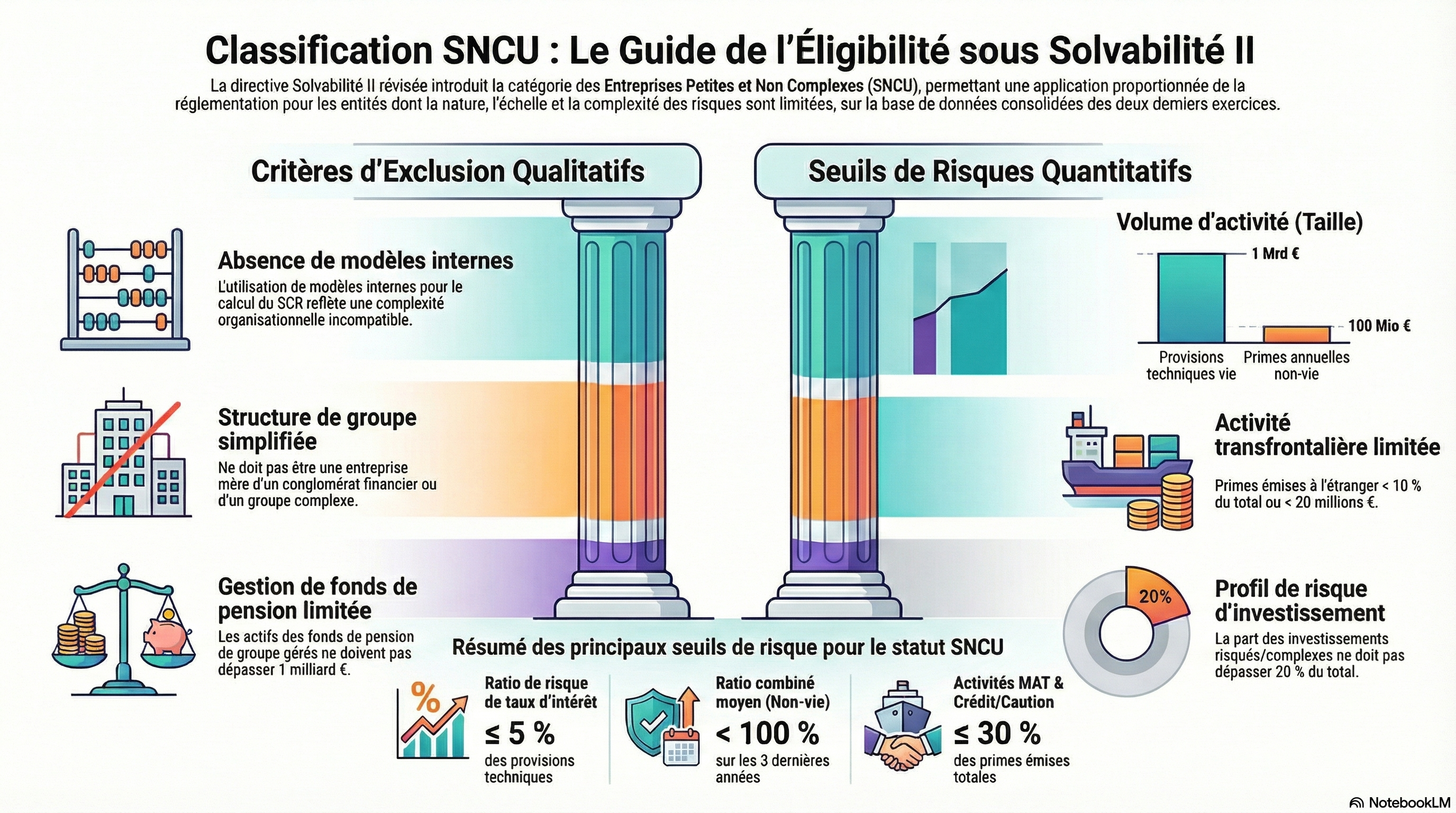 - Captives d'assurance et de réassurance : Elles bénéficient d'une exemption pour les indicateurs 3 (transfrontalier) et 8 (réassurance acceptée). Une dérogation permet d'accéder au statut SNCU même en cas de dépassement d'autres seuils, si les risques sont strictement internes au groupe, si les personnes physiques couvertes représentent moins de 5% des provisions techniques, et à condition qu'aucune assurance de responsabilité civile obligatoire ne soit souscrite.