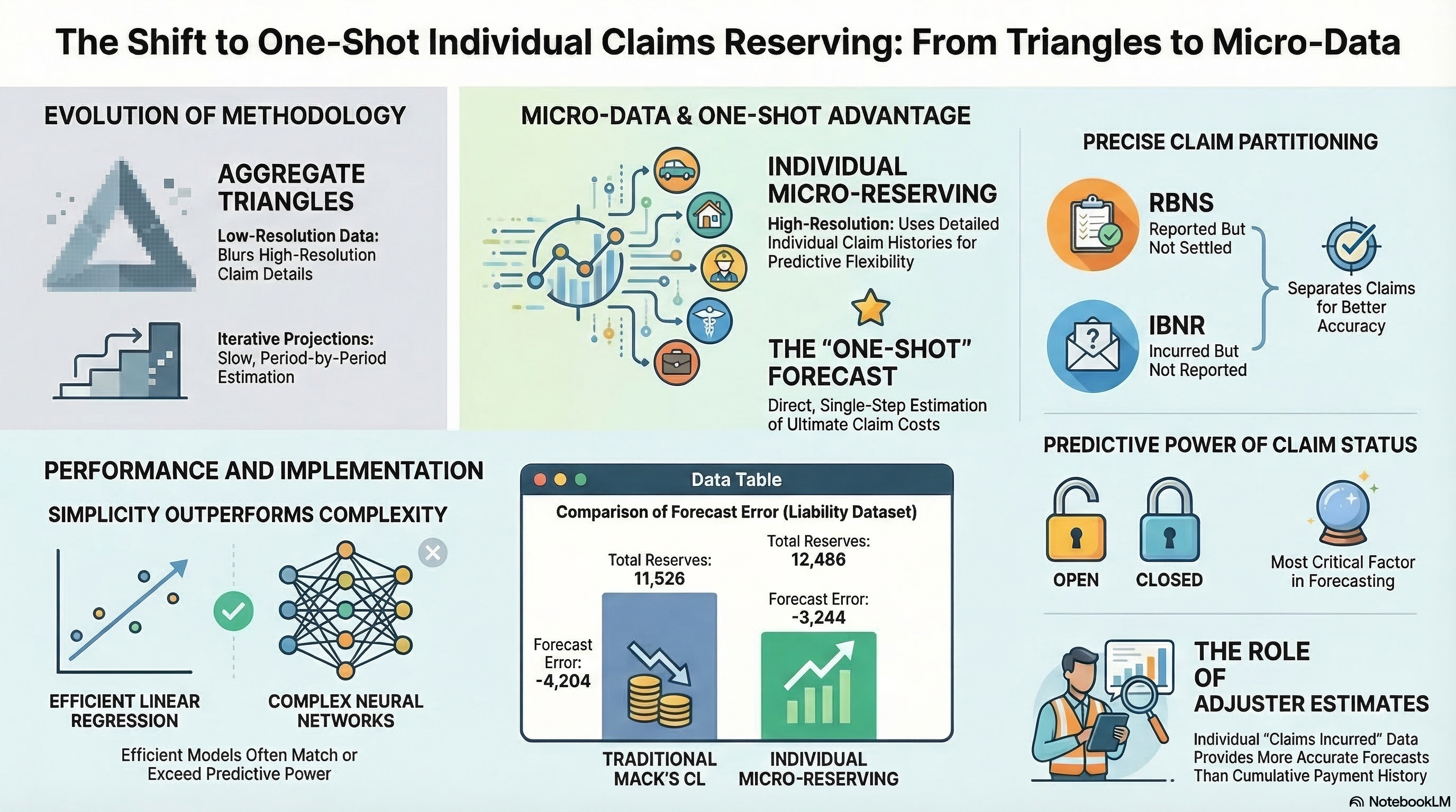 This research explores individual claims reserving, specifically focusing on the one‑shot projection‑to‑ultimate (PtU) method as a modern alternative to the traditional chain‑ladder approach. The authors demonstrate how to transition from aggregate data triangles to granular, claim‑level modeling by directly estimating ultimate costs rather than using iterative year‑over‑year steps. This framework allows for the integration of stochastic covariates and machine learning techniques, such as neural networks and transformers, while maintaining a mathematical link to classical actuarial standards. The paper highlights a crucial decomposition of reserves into Reported But Not Settled (RBNS) and Incurred But Not Reported (IBNR) categories to ensure consistent claim cohorts. Through empirical case studies in accident and liability insurance, the text shows that linear regression often provides robust results for individual claims, effectively bridging the gap between simple aggregate methods and complex predictive modeling.
