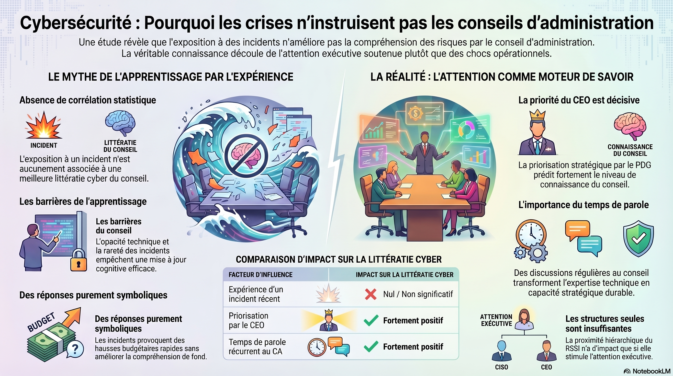 Cette étude remet en question l'idée reçue selon laquelle les entreprises apprennent automatiquement de leurs échecs numériques, en démontrant que les incidents de cybersécurité n'améliorent pas la compréhension des risques au niveau du conseil d'administration. Les auteurs soulignent que l'exposition directe à des crises techniques reste souvent inefficace, car ces événements sont rares, opaques et filtrés par des experts. Au lieu de compter sur l'expérience, la littératie numérique des dirigeants dépend principalement d'une attention exécutive soutenue, impulsée par les priorités du PDG et un temps de parole régulier en réunion. Les structures de gouvernance, comme la proximité hiérarchique du responsable de la sécurité, n'ont d'impact que si elles servent à maintenir cette attention délibérée. En conclusion, sans un engagement proactif et stratégique, les incidents ne provoquent que des réponses symboliques sans véritable évolution cognitive au sommet de la firme.