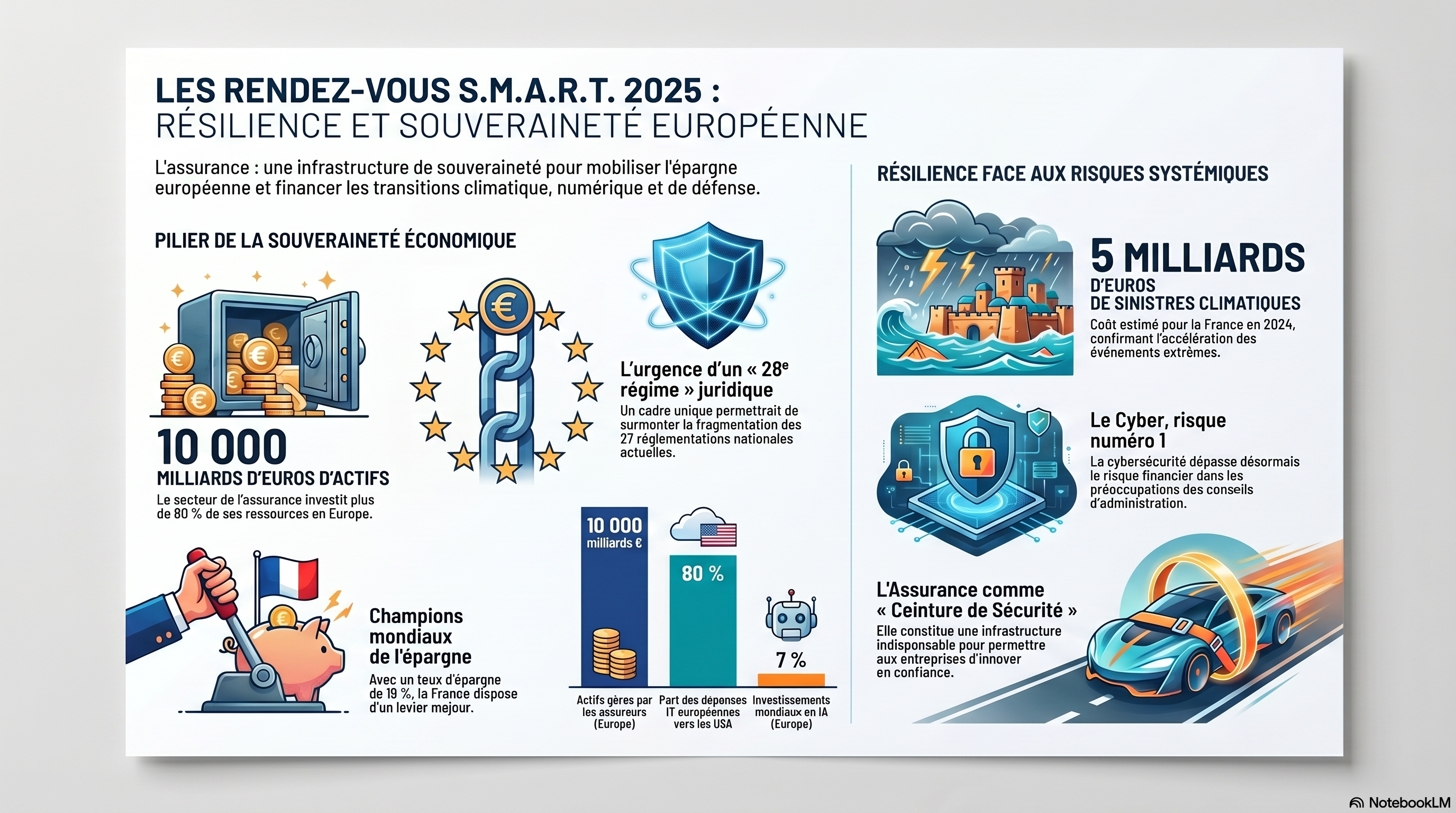 Sommaire : Cet article étudie la synthèse des Rendez‑vous S.M.A.R.T. 2025, un sommet organisé à Bruxelles par France Assureurs pour traiter de la résilience et de la souveraineté européenne. À travers des discours de dirigeants et des tables rondes d'experts, les sources soulignent le rôle crucial du secteur de l'assurance comme moteur d'investissement pour la compétitivité du continent. Les débats abordent des défis majeurs tels que le changement climatique, les menaces cybersécurité et l'instabilité géopolitique actuelle. L'objectif global est de mobiliser l'épargne européenne et de simplifier les normes pour renforcer l'autonomie stratégique de l'Union. Enfin, l'événement met en avant l'innovation et l'engagement de la jeunesse pour bâtir une protection durable des citoyens et des entreprises.