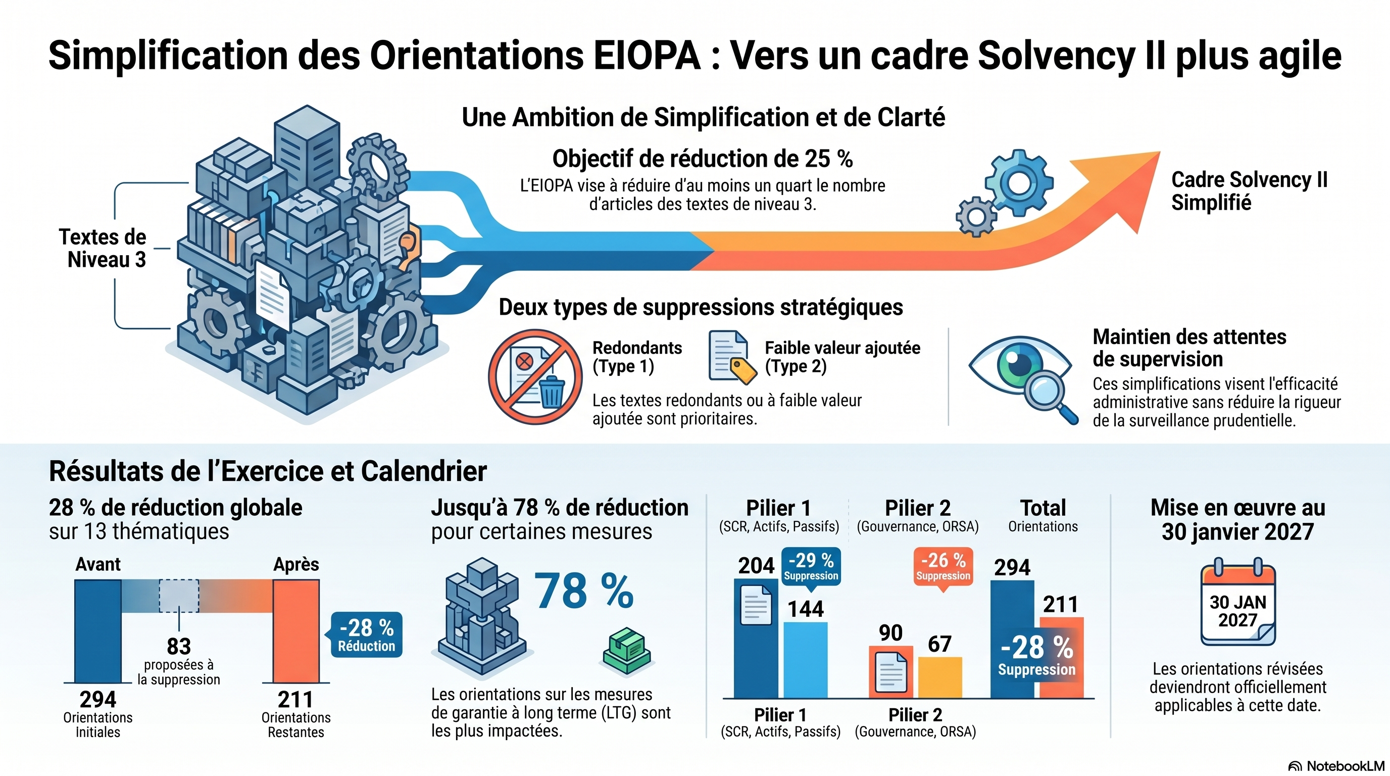 L'EIOPA applique une méthodologie rigoureuse pour élaguer le cadre réglementaire tout en maintenant une supervision de haute qualité. La distinction entre les deux types de suppressions proposées est fondamentale pour les départements de gestion des risques :