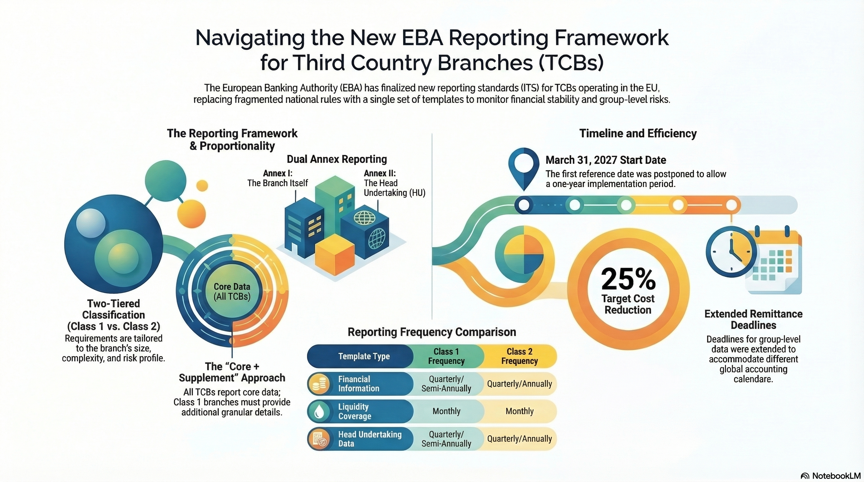 This final report from the European Banking Authority (EBA) introduces new Implementing Technical Standards (ITS) for the supervisory reporting of Third Country Branches (TCBs) operating within the European Union. Established under the CRD VI regulatory package, these standards create a harmonized framework to replace fragmented national rules and ensure effective oversight of foreign banking entities. The reporting requirements are structured around a proportionality principle, distinguishing between Class 1 and Class 2 branches to tailor the volume and frequency of data collection based on an entity's size and risk. Under the new mandate, branches must submit standardized templates covering their own financial and regulatory health, as well as critical information regarding their head undertakings and wider group activities. To ease the transition, the EBA has simplified several data requirements and set the initial reporting deadline for March 31, 2027. This initiative ultimately aims to strengthen financial stability and create a level playing field across the EU banking sector.